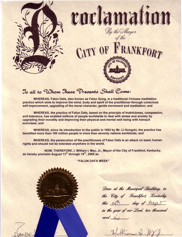 所以,现在,我,威廉姆·美(William May, Jr.),肯塔基州富兰克福特市市长,宣布8月13日至19日为“法轮大法周”。