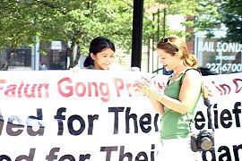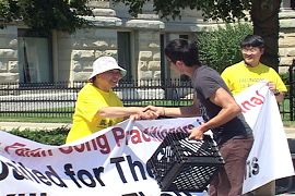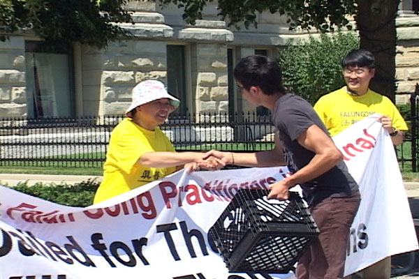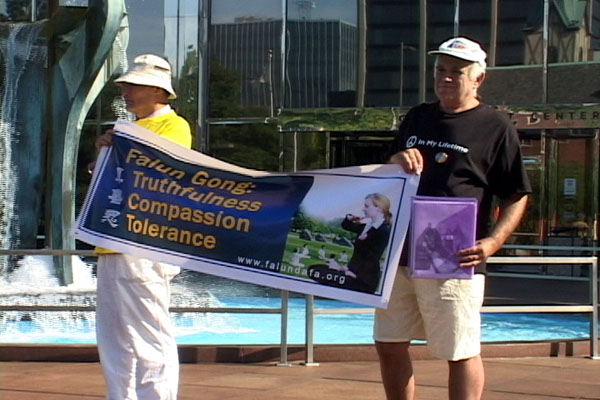 菲利普果真来参加新闻法布会,他对于中国法轮功学员受到的迫害感到同情,于是回到店里,拿了一些水,他与每一个学员握手,并送给每位学员一瓶水。他说,“我真希望更多的俄亥俄州人和美国人能够注意到这件事,并希望我们的关注能够制止在中国的迫害,及将美好的事情带给中国人。我们感谢法轮功学员的到来。”