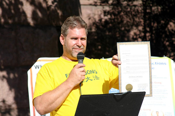 15日,肯塔基州的首府Frankfort市,市长William I. May Jr.给法轮功颁发了褒奖,并谴责中共对人权的迫害。市委员Kathy Cater来到了新闻发布会现场,把市长的褒奖颁给了学员。