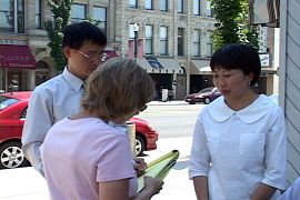 在纷雷市的新闻发布会之前,学员们在一家小店歇息,年轻的店员菲利普得知原来是参加汽车之旅的法轮功学员之后,很亲切的说曾经听他在华盛顿DC的女友谈起今年数千法轮功学员在DC参加大游行和请愿活动,他很高兴现在法轮功学员来到俄亥俄州的纷雷市。学员告诉菲利普,他们来纷雷市开新闻法布会的目的是为了让更多人知道中共活摘法轮功学员器官的暴行,也邀请他过会儿去看新闻发布会。