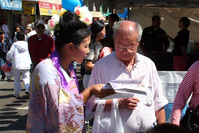 天国乐团的法轮功学员演奏 | ![]() 民众聚集在法轮功摊位前 |