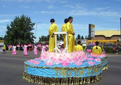 几十支队伍参加了此次游行。法轮大法队伍以横幅开道,其后身着粉色纱裙的仙女队犹如春日桃花,在“普度”的音乐声中翩翩起舞;莲花车上,功法演示柔缓舒展,安静祥和。所到之处,观众热烈鼓掌,惊叹之声不绝于耳,“哇,太美了!””棒极了!”