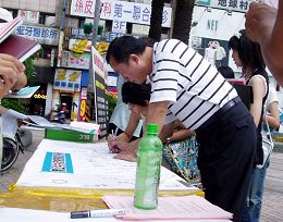 2006年7月30日下午,法轮功学员在台湾基隆市中心公车循环站举行一场制止中共活体摘取器官杀人暴行的征签活动,并呼吁市民如果欲往中国大陆移植器官需三思。