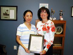 【明慧网2006年8月3日】近日,美国新泽西桥水镇市长Patricia Flannery 女士为新泽西明慧学校桥水镇分校颁奖,对该校将中国传统文化带给当地及附近城镇的各种族学生予以表彰与鼓励。日前,Flannery市长在她的办公室接待了明慧学校的教师,她明确表示欢迎以“真善忍”为宗旨的明慧学校,并与明慧学校的教师合影留念。