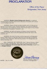 因此,我,桥水镇(美国新泽西)市长Patricia Flannery 宣布本市欢迎和鼓励明慧学校将多元文化带给我们。