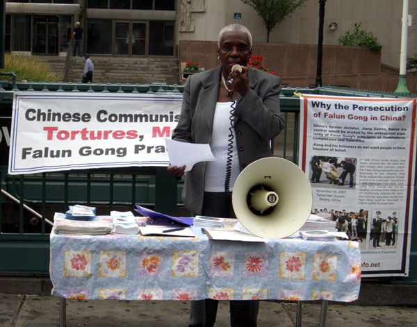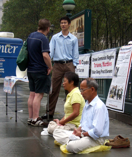 【明慧网2006年8月30日】(明慧记者采菊报道)2006年8月28日上午,秋雨时不时的飘落,在纽约布碌伦区的最高法院前,两位精神抖擞的老人静静的打坐。在他们的身后,横幅和画布展示着中共对法轮功学员的残酷迫害和虐杀。
