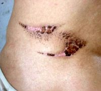 ![]() 李世刚的腿部多处被打坏 | ![]() 李世刚的腰部伤痕仍清晰可见 |