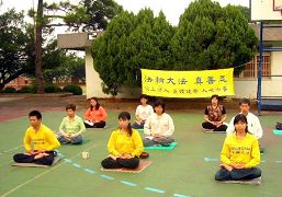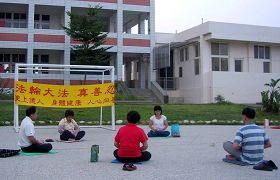 学员每天在4点20分以前到达校园并将“法轮大法”横幅挂上,4点20分开始炼静功,6点40炼完五套功法。当红彤彤的太阳从东方徐徐升起时,每位学员充满朝气的回到负责的工作岗位上,开始活力十足的一天。一旁到此运动的居民有时也会跟着炼,也有的仿佛喜获福音般的表示要参与炼功。