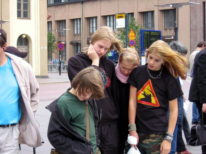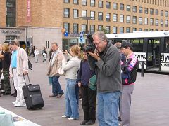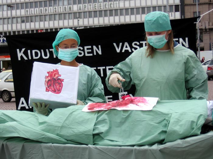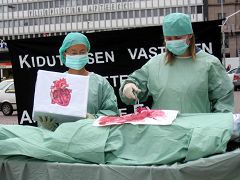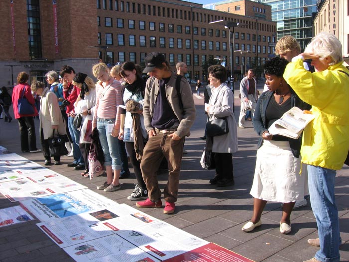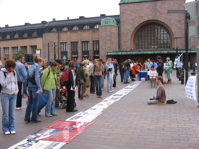 【明慧网二零零六年九月十三日】二零零六年九月八日、十日两天,亚欧峰会于芬兰首都赫尔辛基召开之际,来自欧洲十三国及北美的部份法轮功学员汇集赫尔辛基,藉36个亚欧国家首脑和两千多位媒体工作者云集之时,在赫尔辛基火车站和海滨大道公园(Esplanad Park)两处同时举办揭露中共活体摘取人体器官的模拟演示,并以真人模拟和图片展示的方式揭露中共灭绝人性的迫害法轮功学员的暴行,同时呼吁各国政府和人民共同制止中共迫害法轮功。