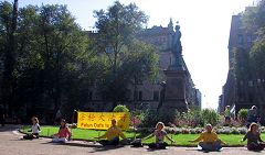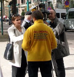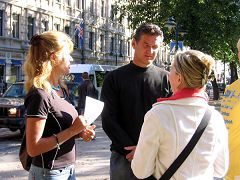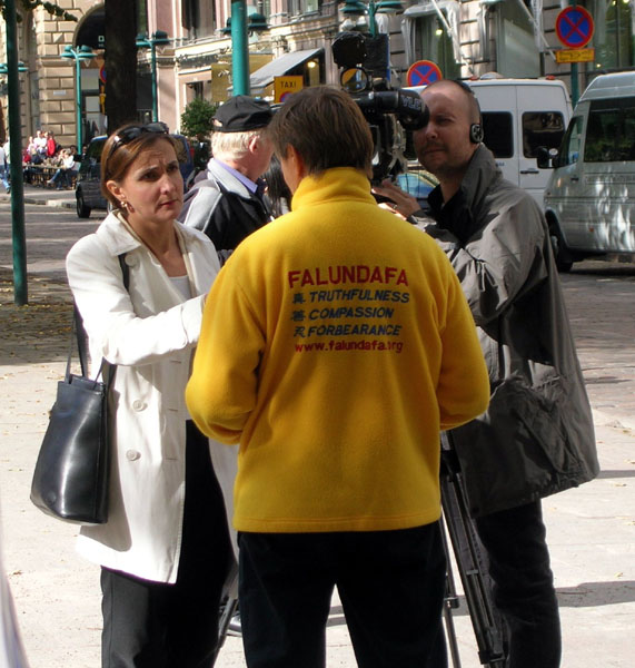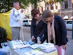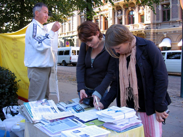 几天来,学员们从上午站到傍晚,用祥和的法轮功功法演示展现大法的美好;面带微笑,向行人递上揭露中共七年来对法轮功学员残酷迫害的真相传单。活动前赶印的一万五千份芬兰文传单,最后所剩无几,几百份的中、英文《九评共产党》送到了人们手中。