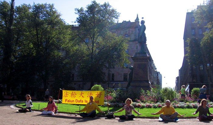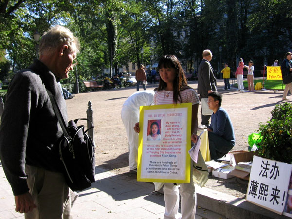 【明慧网二零零六年九月十三日】二零零六年九月九日、十日、十一日三天,亚欧峰会于芬兰首都赫尔辛基召开之际,来自欧洲十三国及北美的部份法轮功学员汇集赫尔辛基,藉36个亚欧国家首脑和两千多位媒体工作者云集之时,在赫尔辛基海滨大道公园(Esplanad Park)一侧,用展示大法美好和揭露中共灭绝人性迫害法轮功的横幅及图片筑起了一道勇气长城。