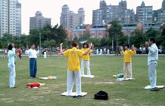 【明慧网二零零六年九月十四日】清晨的四点十分至六点四十,在桃园中正公园千坪大草坪的一角,有幅法轮功学员围成一圈,打坐、炼功、读书的画面。随着三年多的春夏秋冬季节背景更换,刻画着学员们修炼的岁月痕迹。