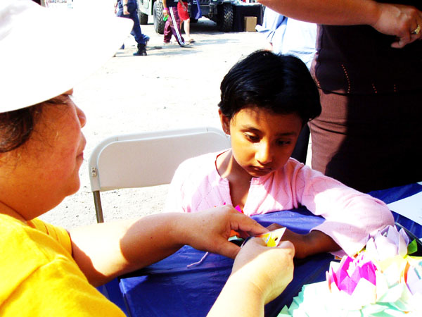 一个来自印度的五岁小姑娘跟着父母来到法轮功摊位,爸爸劝小姑娘说,你还小,还不会叠花。小姑娘坚持说可以!因为人多,一时不能靠近,爸爸又建议先去别的地方,小姑娘无奈只好反复提醒学员“你们一定等着我呀!”很快小姑娘和父母又回来了,她如愿学会了叠莲花,又在莲花下系了一个小女孩炼法轮功功法的小卡片,才高兴的离开。