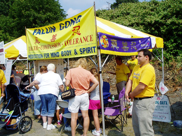 学员除了在摊位旁分发资料、功法演示外,折叠纸莲花更吸引大人和孩子们。游客、来自新英格兰地区及纽约州的三十五支参赛队,以及与会贵宾罗州议员肯尼迪、罗州副州长Charles Fogarty、黑石河旅游中心主任Bob Billington及台湾经文处处长杨国栋等人都有机会看到法轮大法真相。