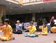 法轮功学员宁静祥和的功法展示吸引了人们来了解和学功