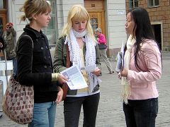 很多人走过来问如何才能帮那些无辜受迫害的中国法轮功修炼者,发资料的学员说,“我们要向全世界昭示中共的罪恶,帮我们把中共的罪恶及退党的消息传递给你的同事和亲朋好友,让他们到网站上签名吧。”了解到共产党罪恶的人们纷纷说:“支持你们!”“祝好运!”