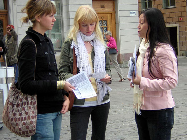 很多参观完皇宫换岗仪式的中国游客都拿了揭露中共活摘器官的资料和九评报纸。活动中散发了大量的瑞典文、英文、中文的真相资料和退党信息。