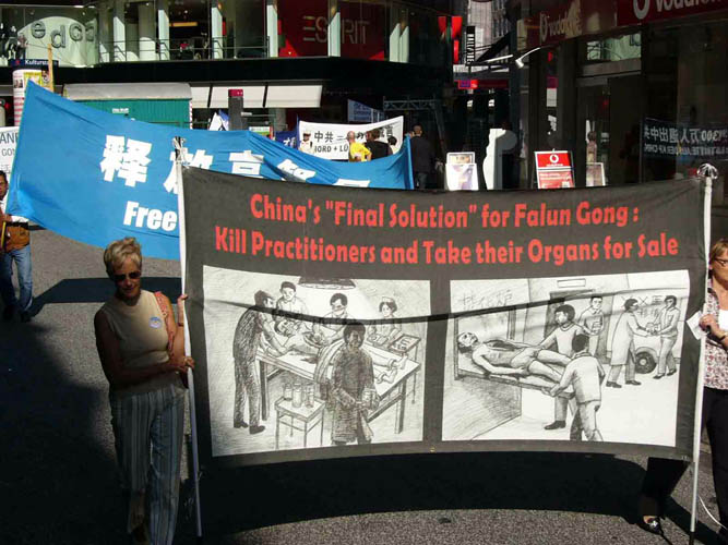 一个西方人在游行队伍中拿着话筒告诉满腹疑问的人们:“我们都知道在中国至少有二千多个集中营、劳教所,那里人们被奴役。但是您可能还没有了解到,今年三月我们得知在中国大量的集中营里,法轮功学员和异议人士被根据需要活体摘取器官,年轻鲜活的生命被作为活体器官库,随时可以被开膛剖肚。”现场录音(德语):lautsprecherm.p3(974KB)