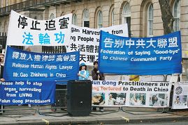 二零零六年九月十三日星期三,英国首相在官邸接待访问英国的中国总理温家宝时,法轮功学员在官邸对面举行活动,抗议中共对法轮功施加的残酷迫害,要求制止迫害,严惩迫害元凶江泽民、罗干、刘京及周永康,并立刻進行司法审判。