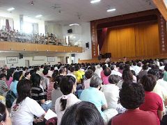 台湾嘉义地区法轮功学员二零零六年九月十七日在嘉义县朴子市东石高中举办一日学法交流,当天是个天气晴朗的礼拜日,外埠尤其是台湾南部学员也赶来参加,上千名学员们在嘉义县朴子市东石高中的大礼堂席地而坐,集体学法交流,一楼都坐满了,连二楼也座无虚席。