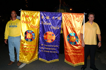 当天晚上的游行,两名学员拉着点缀了彩灯的“法轮大法”横幅走在最前面,随后是最吸引人们的由法轮功学员们表演的仙女舞蹈,两旁的民众给予了热烈的掌声。