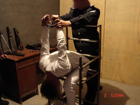 恶警把雷明抬到铁老虎椅上,然后把雷明的双脚绑紧,用铁棍横穿老虎椅扶手,用锁头把椅子锁死。然后将雷明双手反背,两腋窝卡在椅背上,然后用一条牛皮带从手铐中间穿过,经椅子腿的横穿上绕上来,两恶警恶狠狠的使劲地往下拉牛皮带,其中一个气急败坏的恶警用脚猛踹手铐。