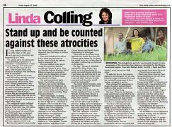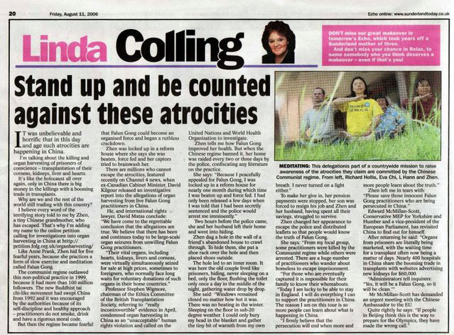 文章说,真是令人感到难以置信与可怕,在今天这个时代,在中国竟然正发生着这样的暴行。我说的是有关谋杀良心犯、盗取器官的事──移植他们的眼角膜、肾脏、肝脏和心脏。那就象纳粹大屠杀事件的重演,就在中国,随着器官交易的兴起,杀人(摘取器官)隐藏着巨额的金钱交易。