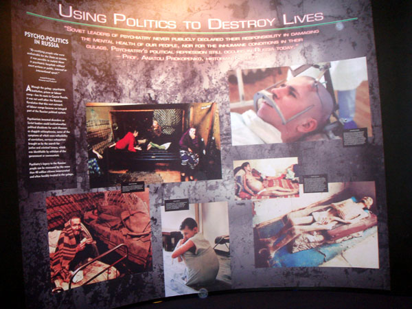 这次展览介绍了精神病学和心理学被利用来对于特定的种族、团体和异见分子進行虐待、攻击和有计划的灭绝行动。包括二次世界大战时的纳粹集中营、苏联古拉格群岛及现在正在中国发生的法轮功团体所遭受的严重的精神摧残。所谓“古拉格”,即“劳动改造营管理总局”,原是苏联劳改制度的象征。苏联的古拉格和纳粹的集中营、柬埔寨的杀人场同样臭名昭著,成为了极权政治统治下超强度的死亡劳改集中营的一个代称。