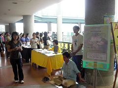 展场人声喧闹,表演“神通加持法”的学员,肃穆的平伸双臂,席地盘腿炼功,另一位学员播放炼功音乐,解说功法特点,吸引许多学生的目光。一位学员说:“当初我也是感受了法轮功的美好而走进了大法,修炼以后,才了解原来法轮大法这么精深博大,祝福有缘人都能得到这部宇宙大法”。