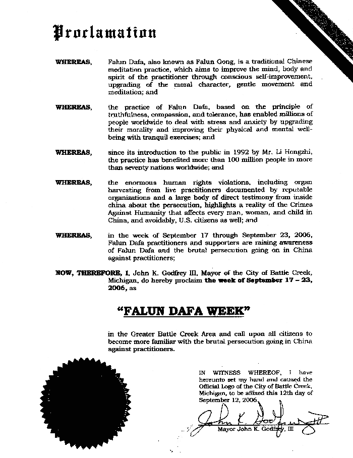 因此,我,约翰•高德弗雷 (John K Godfrey III), 密西根州百投溪市市长特此褒奖二零零六年九月十七日至二十三日为百投溪市地区的