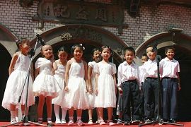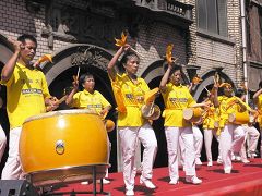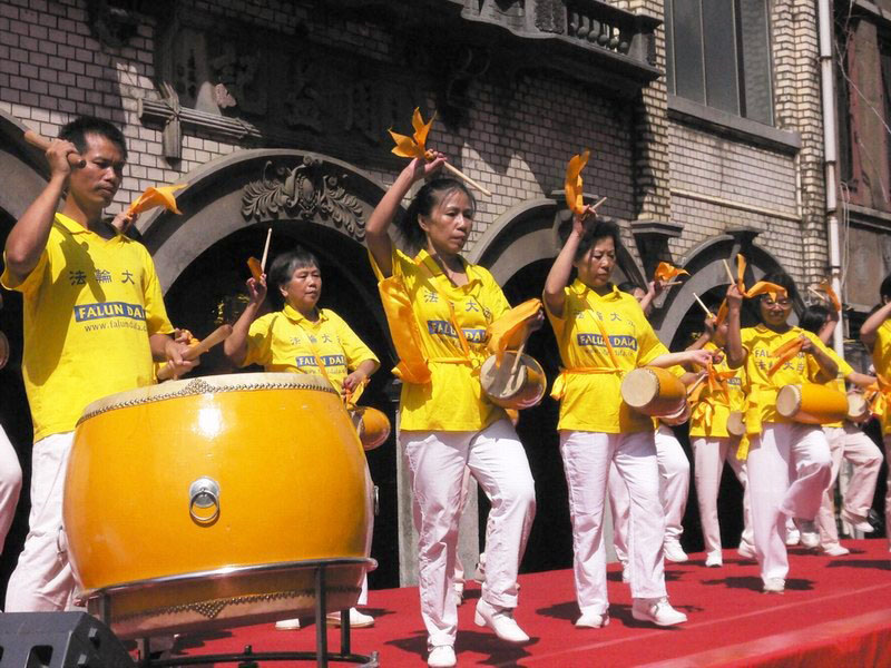 二零零六年九月二十四日在新竹市闹区举办的“贡丸节”开场,表演节目由法轮功新竹腰鼓队开场,鼓声随着“法轮大法好”的音乐传遍全场。随后由法轮功弟子轮流上阵表演才艺,有小提琴、陶笛吹奏、二胡独奏“为你而来”、“赛马”等。接着由十二位大法小弟子演唱“小天使”、“插莲花”,并背诵《洪吟》〈苦其心志〉、〈做人〉等,小弟子纯真可爱的模样,让现场观众发出会心的微笑。