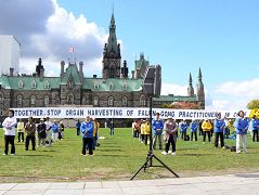 二零零六年九月二十六日,法轮功支持者和多名国会议员在加拿大国会山前集会,呼吁加拿大政府和人民共同制止中共活体摘取法轮功学员器官的罪行。