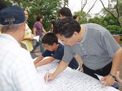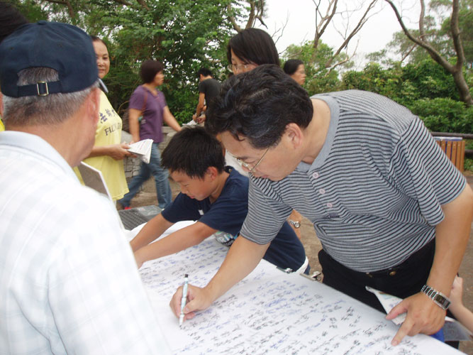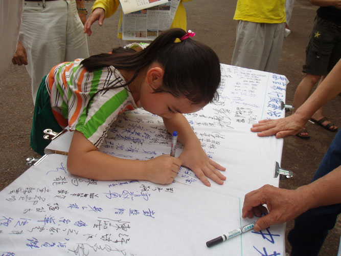 来自韩国的四位青年透过朋友的翻译明白真相后拿起笔签下正义的支持。