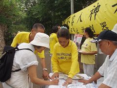 一位女士开始不解的问:“台湾与大陆有啥关系?”学员回答说有很大的关系。目前有很多的台湾人到大陆去换肝换肾,因为得不到保障回来台湾后产生许多问题,包括失去生命。另台商到大陆投资遭到迫害钱财散尽,回来投诉无门下场很惨!女士听完后不发一语,若有所思。