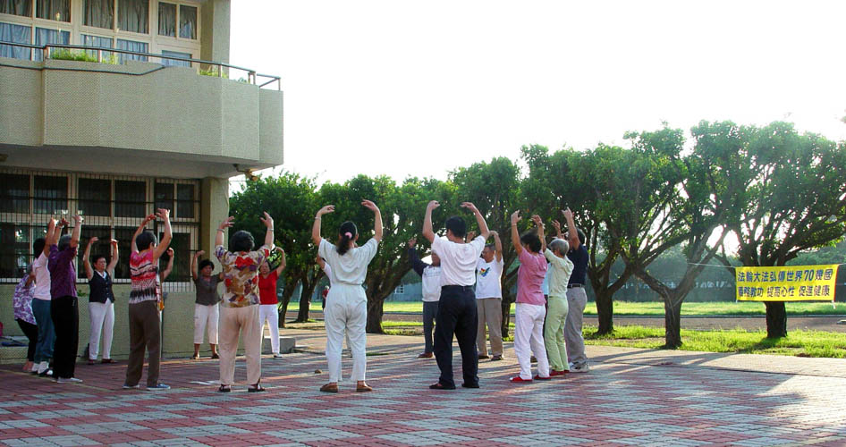 炼功时间是每天早上五点半到八点十分,五套功法都炼完后,会再加炼第一套功法。目地是让前来户政事务所更换身份证的居民们有机会看到优美的法轮功功法。星期六则只炼动功一小时,利用另一小时学法交流。