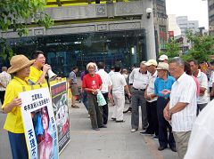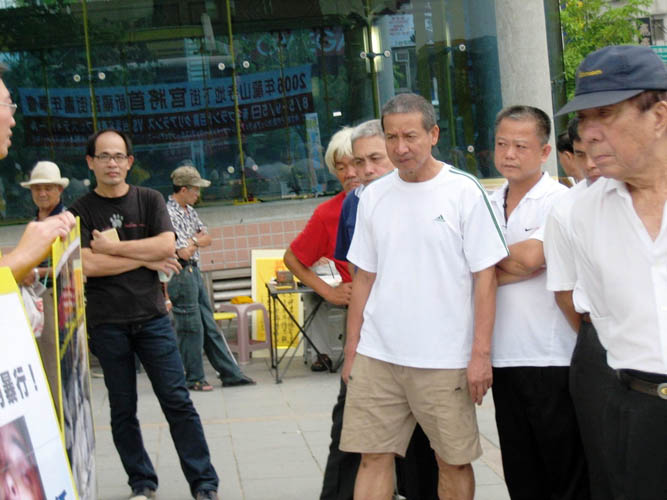 假日午后的龙山寺前广场,许多民众聚集在法轮功学员带来的展板前,议论纷纷。