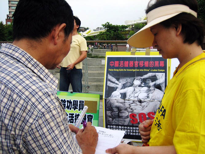 因为不知情,有很多台湾民众都到中国做器官移植手术,一位先生就跟法轮功学员说:“我有几个朋友到中国换肾,没去换的时候,虽然在做洗肾治疗,还是活的好好的,去换回来没多久就死了,现在才知道,原来是器官来源有问题。”