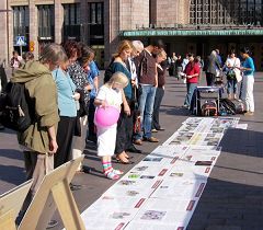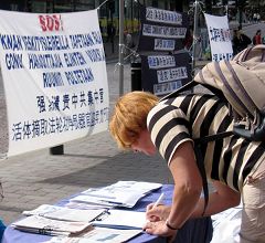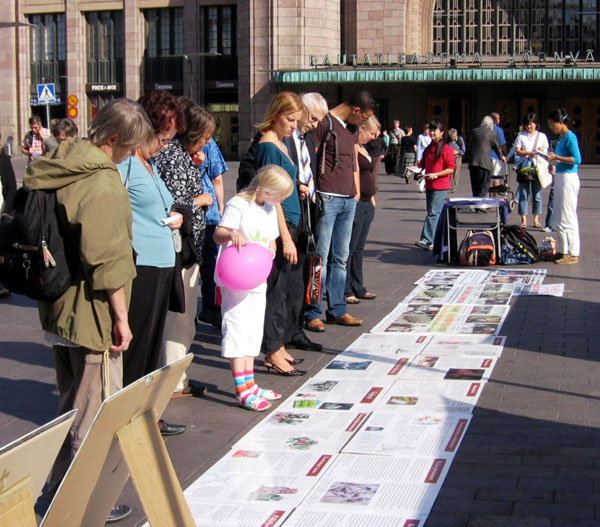 【明慧网二零零六年九月七日】二零零六年九月二日,正值欧盟—中国峰会和亚欧峰会(ASEM)在芬兰首都赫尔辛基(Helsinki)召开之时,芬兰退党服务中心、大纪元义工及法轮功学员在赫尔辛基市中心火车站旁开展活动,声援一千三百万中国民众退出中共一切相关组织,声援原东航机长袁胜传九评促三退的义举,强烈谴责和抗议中共非法抓捕大陆著名维权律师高智晟,并揭露中共活摘法轮功学员器官的罪恶行径。