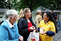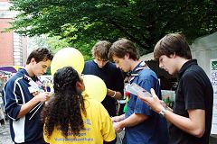 法轮功展台前的人群始终络绎不绝,几名童子军协会的年轻人也前来看个究竟,他们友善的和学员交谈起来,当得知中共长达七年残酷迫害法轮功的情况后,他们被震惊了,默默的认真听着。最后学员心情沉重的说:“我们每一个人都有责任帮助尽快结束这场迫害。”他们点点头,表示会上网去了解更多的大法信息。