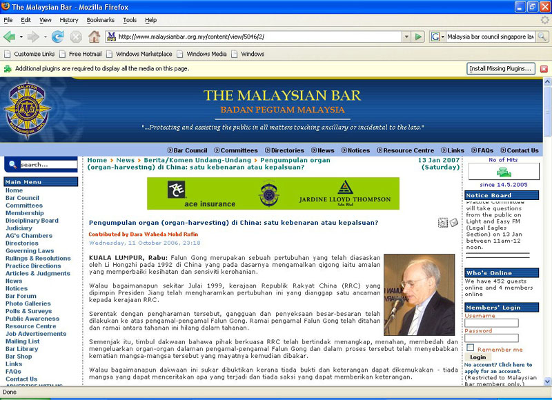 马来西亚律师公会网站报导加拿大独立调查团成员大卫•麦塔斯(David Matas)受邀在马来西亚律师公会举办的公开论坛。