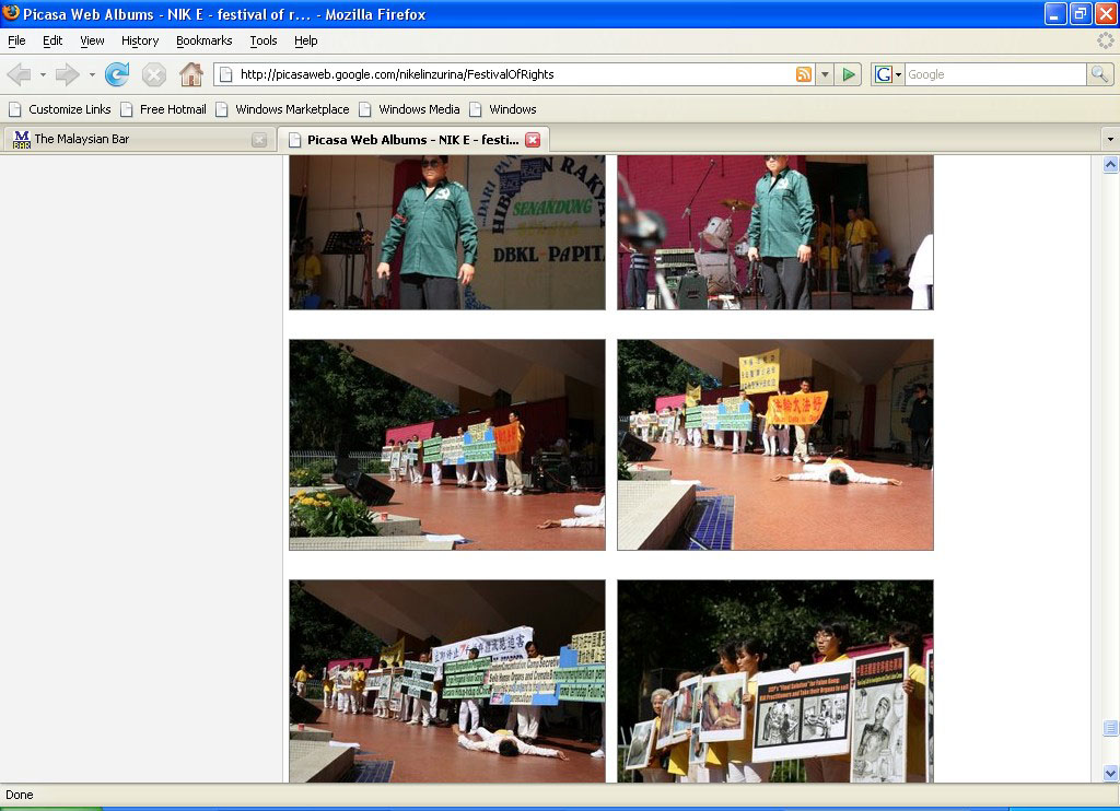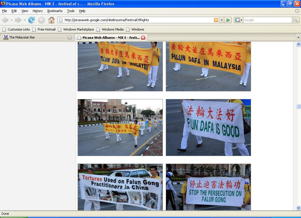 马来西亚律师公会网站人权日文章的连线图片库中放了多张当天的活动照片。以上为法轮功学员游行的部份照片