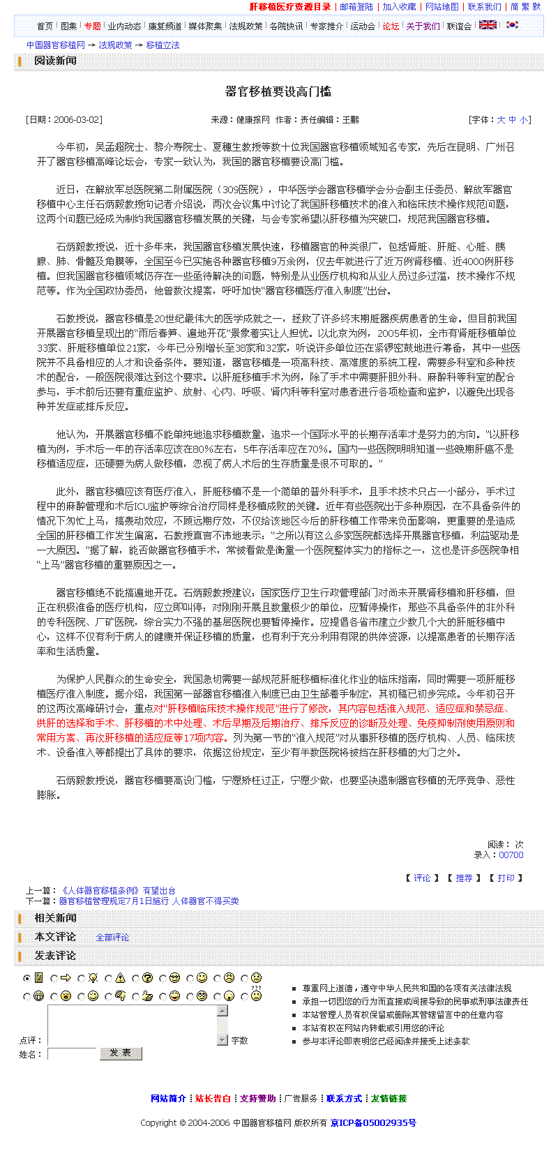 石炳毅教授的数据来自一篇中国器官移植网的报导,在该网的一篇题为“器官移植要设高门槛”的文章中,石炳毅教授说,“全国至今已实施各种器官移植九万余例,仅去年就进行了近万例肾移植、近四千例肝移植。”