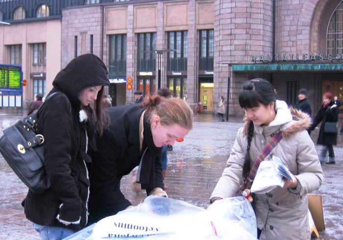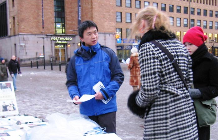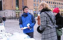 当法轮功学员阿妮娅(Anija)向一位芬兰人递上真相传单时,这位芬兰人说:“我知道,几年前我去过中国,我在天安门广场亲眼见到几个警察抓住法轮功学员将他们扔到警车上的情景。太残暴了。”