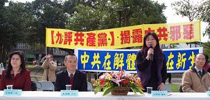 桃县议员邱素芬在百忙中前来声援。邱议员说,苏共解体不是经济问题,而是人民的心声,今天中国有这么多人唾弃共产党,并非经济不好,而是共产专制独裁遭百姓唾弃,更是全中国人民的心声。邱素芬议员在记者会上强烈谴责了共产党没有人性,并说在共产党高压独裁统治下,百姓没有自由。
