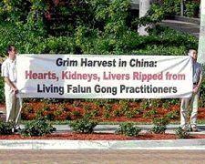 法轮功学员在Marriott宾馆外举横幅,呼吁关注发生在中国的迫害。横幅上写着,“可怕的‘收割’正在中国進行:心脏,肾脏和肝脏从活着的法轮功学员体内取出”。