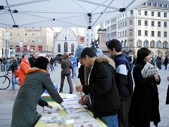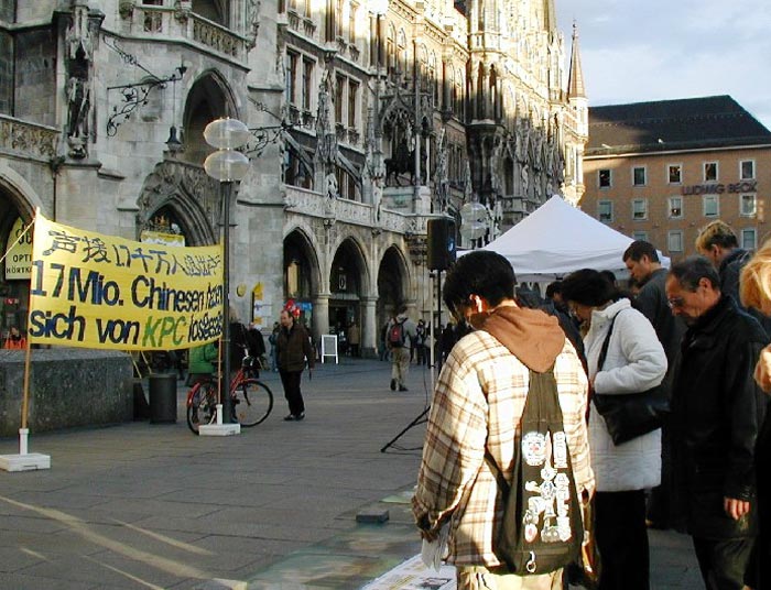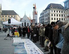 慕尼黑的法轮功学员打出声援一千七百万中国人退出中共、谴责中共活体摘取法轮功学员器官等横幅,信息台前站满了各国民众,人们耐心的等待,要在给德国政府呼吁制止中共劣行的信上签名,表达他们的震惊、愤慨和制止迫害的心愿。一位刚刚签了名的妇女告诉记者,中共的这种行径不可理喻,她无法不站出来表达心声,必须制止这一切。还有一位妇女以前家在共产党统治的捷克斯洛伐克,她告诉记者,她非常明白在中国发生的事情,因为共产党都这么干。