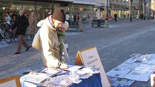 通过义工和法轮功学员的手,把一张张揭露邪恶中共罪行、讲述它七年多来对法轮功学员惨无人道的迫害,特别是活体摘取法轮功学员器官的暴行的传单递送到芬兰民众的手中。一些人看到传单、读过展板及主动了解真相后,说:谢谢,你们做的很好。有的问:我能帮你们做点什么?更多的人则是签名声援反迫害。