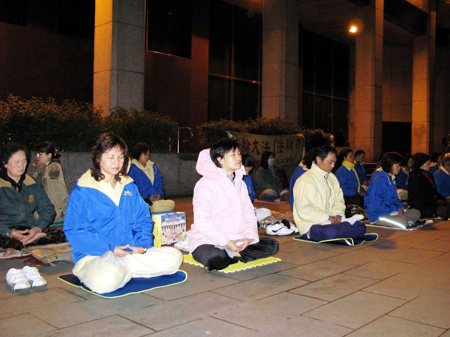 基隆市文化中心广场刚好是法轮功学员每天集体炼功的炼功点,为了洪法,基隆市其它炼功点的学员早上四点五十分也到此集体炼功。升旗前,许多民众已经陆续到达现场,并且看到法轮功学员炼静功。一边是法轮功学员集体炼功,一边是群众聚集参加升旗典礼,场面祥和。