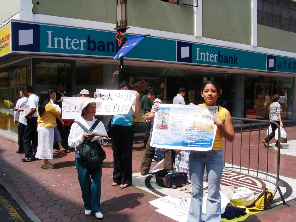 【明慧网二零零七年一月四日】二零零七年的第一天,早上九时,秘鲁首都利马唐人街中心的甲邦街迎来一群西人法轮功学员。他们向前来喝早茶、会友的中国人道一声中文:新年快乐!送上作为新年珍贵礼物的一份《九评共产党》小册子。收到小册子的中国人被西人学员真诚友善的举止所感动,情不自禁的向学员道谢。