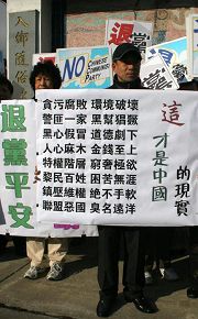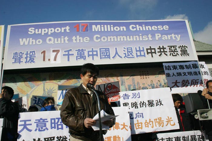 集会现场人头攒动,“九评威力,解体中共”等各种声援退党的横幅、展板林立。“《九评共产党》引发中国人重新认识、审定中共的邪恶本质及罪恶历史,摆脱党文化对思想灵魂的桎梏,并以前所未有的智慧和勇气,纷纷跳离行将沉没的中共破船,与邪灵决裂:公开声明退党退团退队以抹去邪恶兽印的三退大潮,从涓涓细流已经汇合成滔滔江河,从每天的几百人几千人到上万人,至二零零六年的最后一个月十二月更是突破单月三退人数百万大关,三退总人数已经超过一千七百万!勇于与恶党决裂的勇士们就象千帆竞发,万木迎春,不但给自己开创了未来,并正在中华大地推动着道德与良知复苏、人性回归的伟大精神觉醒运动,给中华复兴带来希望和方向。……”退党服务中心的声明响彻在华埠广场,引来路人关注、赞誉的目光。